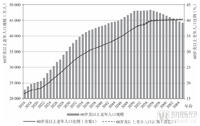 2021年,中国人民大学人口与发展研究中心杜鹏教授发表了《新时代中国人口老龄化长期趋势预测》的论文。文章结合现阶段人口规模与结构、死亡水平与模式、生育水平与模式等因素,通过两种方案的参数对未来数十年的老龄化规模进行了预测。预测显示,中国60岁以上老年人口规模在21世纪前半叶持续增长,预计将于2035年、2050年分别达到4.12亿人、4.80亿人。